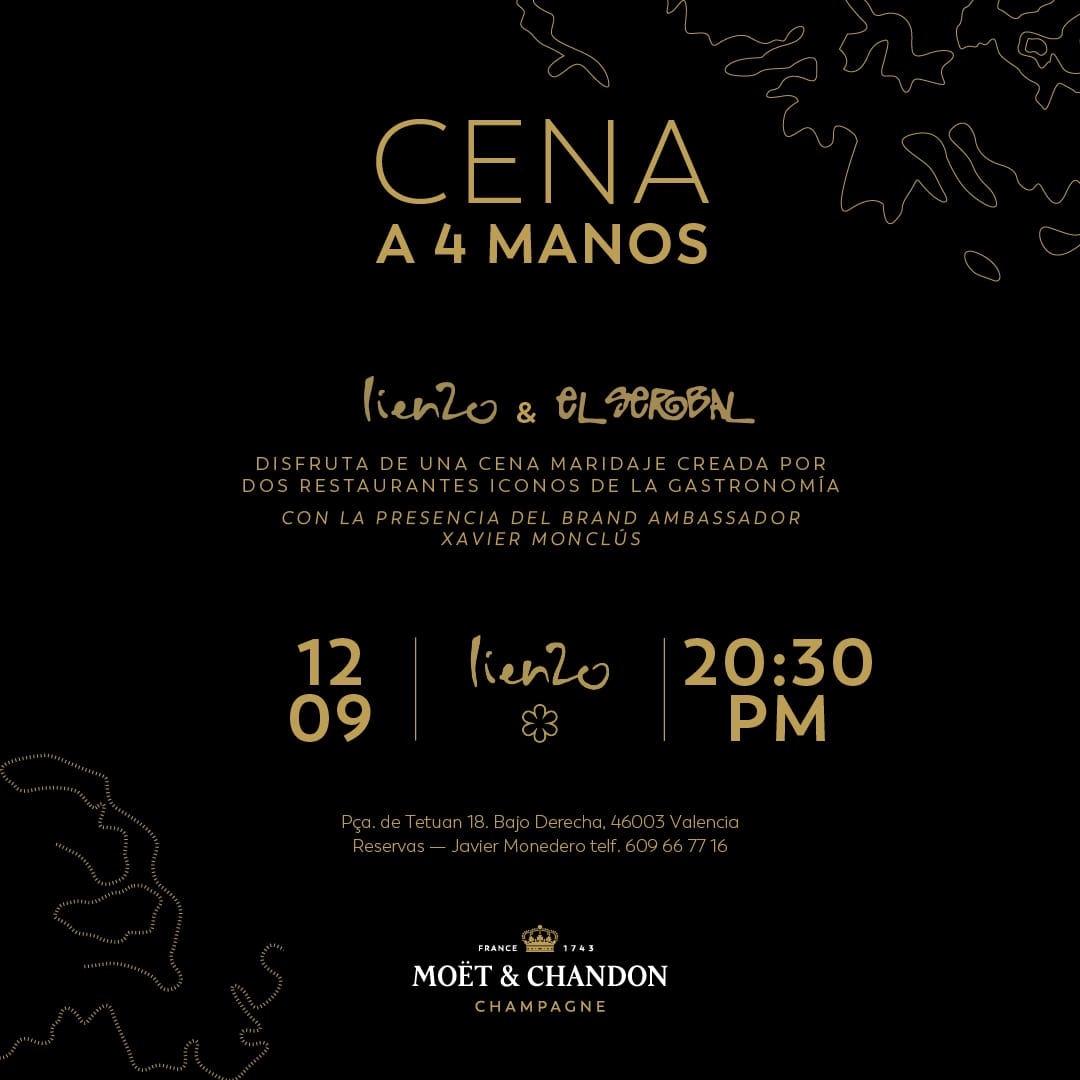 El próximo 12 de septiembre, Lienzo compartirá sus cocinas con el chef Quique Muñoz del restaurante El Serbal* (Santander), en una cena en armonía con exclusivas añadas de Moët & Chandon. El día 26 el equipo de Lienzo repetirá esta cena en el restaurante El Serbal*.