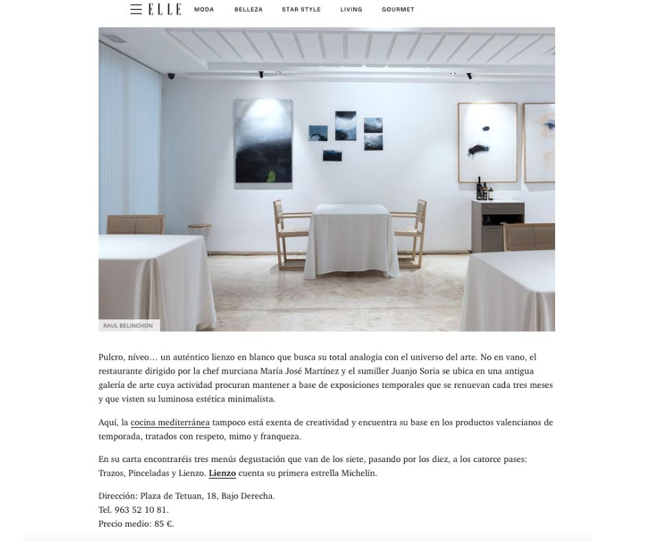 Portada » ELLE selecciona a Lienzo entre los 23 restaurantes de moda de Valencia donde siempre vas a comer bien.
