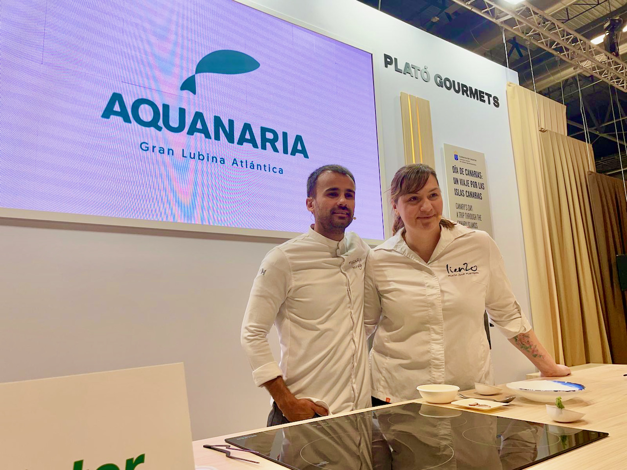 Junto a María José cocinó en esta ponencia el chef Borja Marrero del Rte. Muxgo en Las Palmas de Gran Canaria que posee una Estrella Verde Michelin. El cocinero canario preparó dos recetas, Lubina Aquanaria con pilpil de trebolina demi tostada y caviar de pino y Lubina Aquanaria curada en Corteza de pino y hierbas con agua de tomate. Borja ganó el PREMIO SOSTENIBILIDAD AQUANARIA MADRID FUSIÓN 2023 y María José ha sido la ganadora del mismo premio en la edición del presente año 2024.